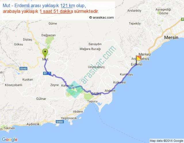 Mut - Erdemli arası yaklaşık olarak 90 km/h ile yukarıda belirtilen sürede olup, iki yerin kuş uçuşu uzaklığı (mesafesi) 78'dir. Yolculuk otobüsle 2 saat 24 dakika sürmektedir.
