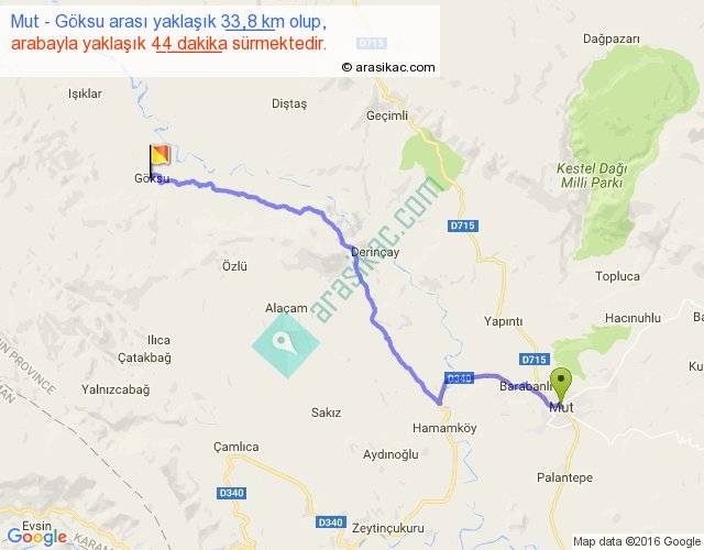 Mut - Göksu arası yaklaşık olarak 90 km/h ile yukarıda belirtilen sürede olup, iki yerin kuş uçuşu uzaklığı (mesafesi) 26'dir. Yolculuk otobüsle 57 dakika sürmektedir.