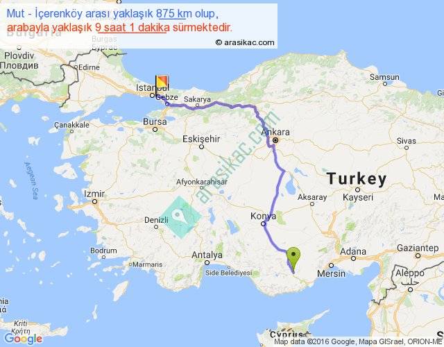 Mut - İçerenköy arası yaklaşık olarak 90 km/h ile yukarıda belirtilen sürede olup, iki yerin kuş uçuşu uzaklığı (mesafesi) 607'dir. Eğer belirtilen yerler arasında uçak seferi var ise bu süre uçakla 56 dakika'ya kadar düşebilir. Yolculuk otobüsle 11 saat 43 dakika sürmektedir.