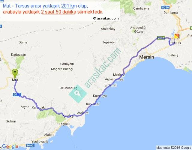 Mut - Tarsus arası yaklaşık olarak 90 km/h ile yukarıda belirtilen sürede olup, iki yerin kuş uçuşu uzaklığı (mesafesi) 133'dir. Yolculuk otobüsle 3 saat 41 dakika sürmektedir.