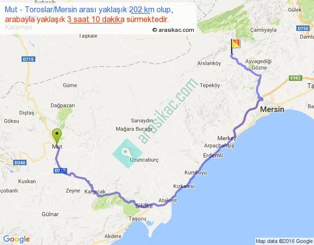 Mut - Toroslar Mersin arası yaklaşık olarak 90 km/h ile yukarıda belirtilen sürede olup, iki yerin kuş uçuşu uzaklığı (mesafesi) 98'dir. Yolculuk otobüsle 4 saat 7 dakika sürmektedir.
