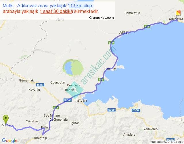Mutki - Adilcevaz arası yaklaşık olarak 90 km/h ile yukarıda belirtilen sürede olup, iki yerin kuş uçuşu uzaklığı (mesafesi) 83'dir. Yolculuk otobüsle 1 saat 57 dakika sürmektedir.