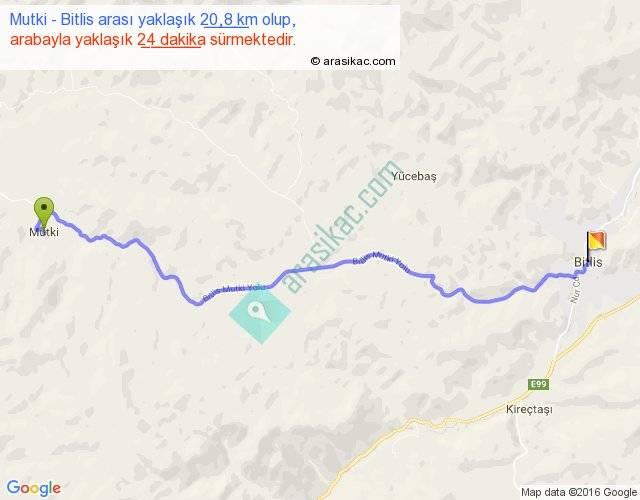 Mutki - Bitlis arası yaklaşık olarak 90 km/h ile yukarıda belirtilen sürede olup, iki yerin kuş uçuşu uzaklığı (mesafesi) 16'dir. Yolculuk otobüsle 31 dakika sürmektedir.