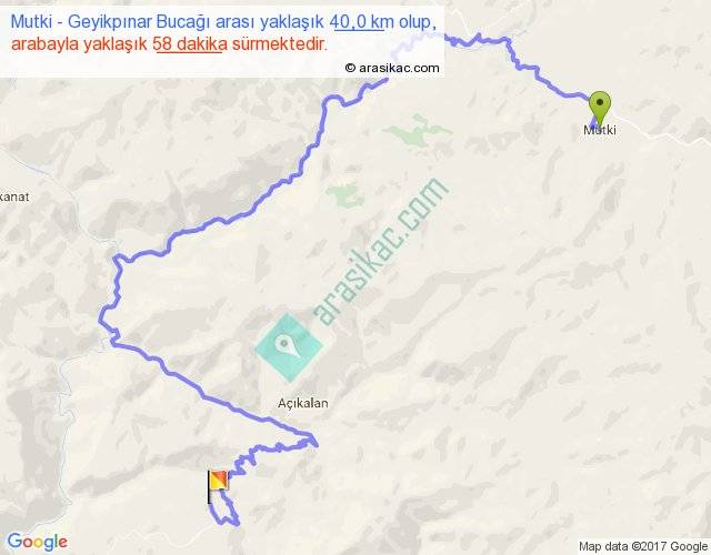 Mutki - Geyikpınar Bucağı arası yaklaşık olarak 90 km/h ile yukarıda belirtilen sürede olup, iki yerin kuş uçuşu uzaklığı (mesafesi) 14'dir. Yolculuk otobüsle 1 saat 15 dakika sürmektedir.