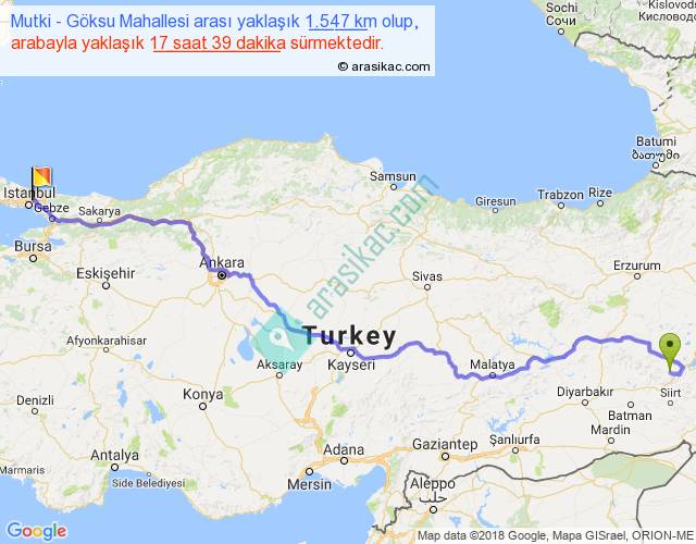 Mutki - Göksu Mahallesi arası yaklaşık olarak 90 km/h ile yukarıda belirtilen sürede olup, iki yerin kuş uçuşu uzaklığı (mesafesi) 1131'dir. Eğer belirtilen yerler arasında uçak seferi var ise bu süre uçakla 1 saat 44 dakika'ya kadar düşebilir. Yolculuk otobüsle 22 saat 56 dakika sürmektedir.
