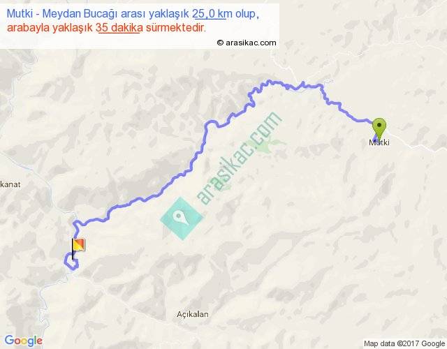 Mutki - Meydan Bucağı arası yaklaşık olarak 90 km/h ile yukarıda belirtilen sürede olup, iki yerin kuş uçuşu uzaklığı (mesafesi) 14'dir. Yolculuk otobüsle 45 dakika sürmektedir.