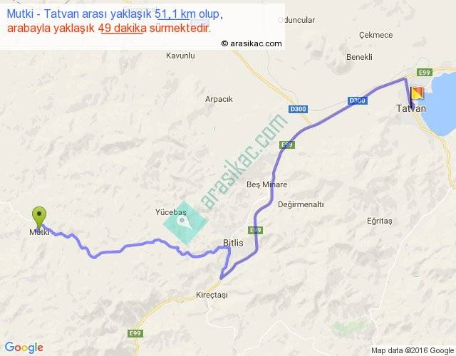 Mutki - Tatvan arası yaklaşık olarak 90 km/h ile yukarıda belirtilen sürede olup, iki yerin kuş uçuşu uzaklığı (mesafesi) 33'dir. Yolculuk otobüsle 1 saat 3 dakika sürmektedir.