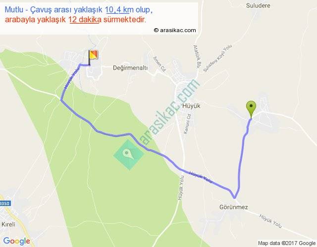 Mutlu - Çavuş arası yaklaşık olarak 90 km/h ile yukarıda belirtilen sürede olup, iki yerin kuş uçuşu uzaklığı (mesafesi) 5'dir. Yolculuk otobüsle 15 dakika sürmektedir.