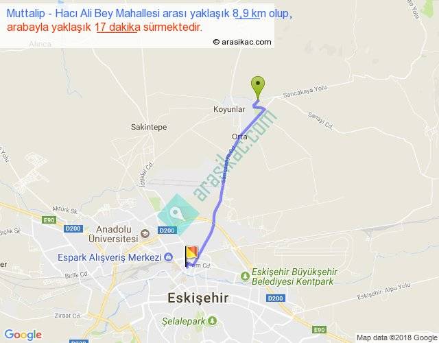 Muttalip - Hacı Ali Bey Mahallesi arası yaklaşık olarak 90 km/h ile yukarıda belirtilen sürede olup, iki yerin kuş uçuşu uzaklığı (mesafesi) 8'dir. Yolculuk otobüsle 22 dakika sürmektedir.