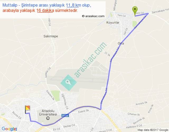 Muttalip - Şirintepe arası yaklaşık olarak 90 km/h ile yukarıda belirtilen sürede olup, iki yerin kuş uçuşu uzaklığı (mesafesi) 8'dir. Yolculuk otobüsle 20 dakika sürmektedir.