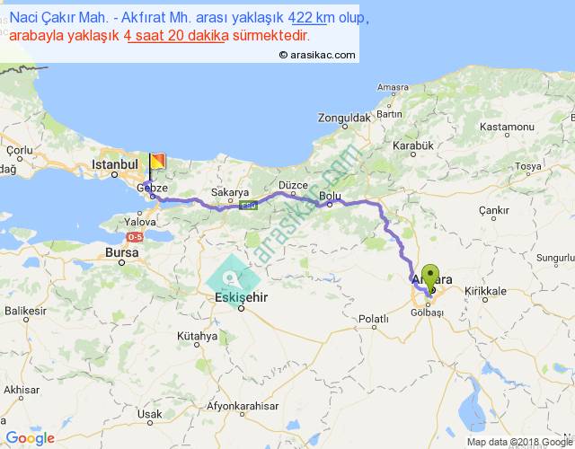 Naci Çakır Mah. - Akfırat Mh. arası yaklaşık olarak 90 km/h ile yukarıda belirtilen sürede olup, iki yerin kuş uçuşu uzaklığı (mesafesi) 312'dir. Eğer belirtilen yerler arasında uçak seferi var ise bu süre uçakla 28 dakika'ya kadar düşebilir. Yolculuk otobüsle 5 saat 38 dakika sürmektedir.