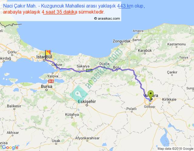 Naci Çakır Mah. - Kuzguncuk Mahallesi arası yaklaşık olarak 90 km/h ile yukarıda belirtilen sürede olup, iki yerin kuş uçuşu uzaklığı (mesafesi) 345'dir. Eğer belirtilen yerler arasında uçak seferi var ise bu süre uçakla 31 dakika'ya kadar düşebilir. Yolculuk otobüsle 5 saat 57 dakika sürmektedir.