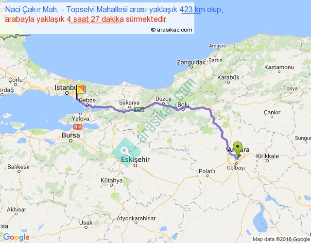Naci Çakır Mah. - Topselvi Mahallesi arası yaklaşık olarak 90 km/h ile yukarıda belirtilen sürede olup, iki yerin kuş uçuşu uzaklığı (mesafesi) 326'dir. Eğer belirtilen yerler arasında uçak seferi var ise bu süre uçakla 30 dakika'ya kadar düşebilir. Yolculuk otobüsle 5 saat 47 dakika sürmektedir.