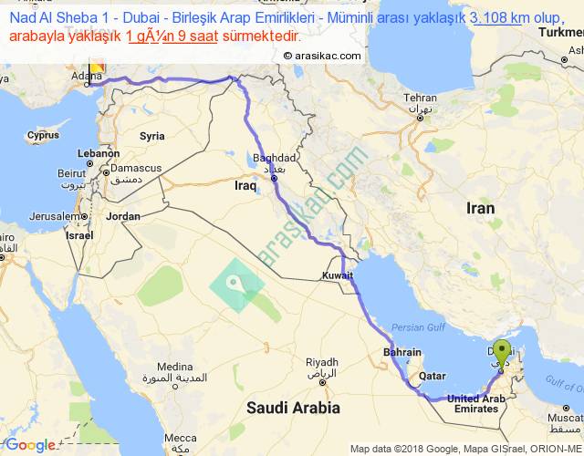 Nad Al Sheba 1 - Dubai - Birleşik Arap Emirlikleri - Müminli arası yaklaşık olarak 90 km/h ile yukarıda belirtilen sürede olup, iki yerin kuş uçuşu uzaklığı (mesafesi) 2278'dir. Eğer belirtilen yerler arasında uçak seferi var ise bu süre uçakla 3 saat 30 dakika'ya kadar düşebilir. Yolculuk otobüsle 1 gün 18 saat sürmektedir.