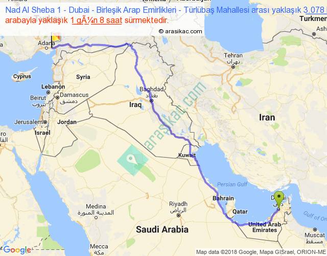 Nad Al Sheba 1 - Dubai - Birleşik Arap Emirlikleri - Türlübaş Mahallesi arası yaklaşık olarak 90 km/h ile yukarıda belirtilen sürede olup, iki yerin kuş uçuşu uzaklığı (mesafesi) 2257'dir. Eğer belirtilen yerler arasında uçak seferi var ise bu süre uçakla 3 saat 28 dakika'ya kadar düşebilir. Yolculuk otobüsle 1 gün 17 saat sürmektedir.