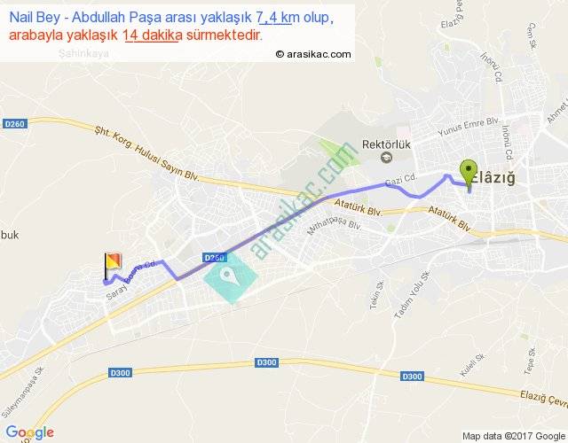 Nail Bey - Abdullah Paşa arası yaklaşık olarak 90 km/h ile yukarıda belirtilen sürede olup, iki yerin kuş uçuşu uzaklığı (mesafesi) 6'dir. Yolculuk otobüsle 18 dakika sürmektedir.