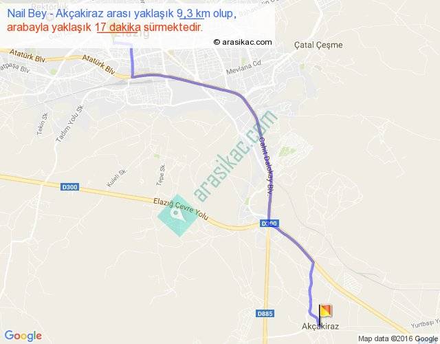 Nail Bey - Akçakiraz arası yaklaşık olarak 90 km/h ile yukarıda belirtilen sürede olup, iki yerin kuş uçuşu uzaklığı (mesafesi) 8'dir. Yolculuk otobüsle 22 dakika sürmektedir.