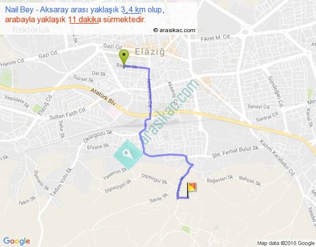 Nail Bey - Aksaray arası yaklaşık olarak 90 km/h ile yukarıda belirtilen sürede olup, iki yerin kuş uçuşu uzaklığı (mesafesi) 2'dir. Yolculuk otobüsle 14 dakika sürmektedir.
