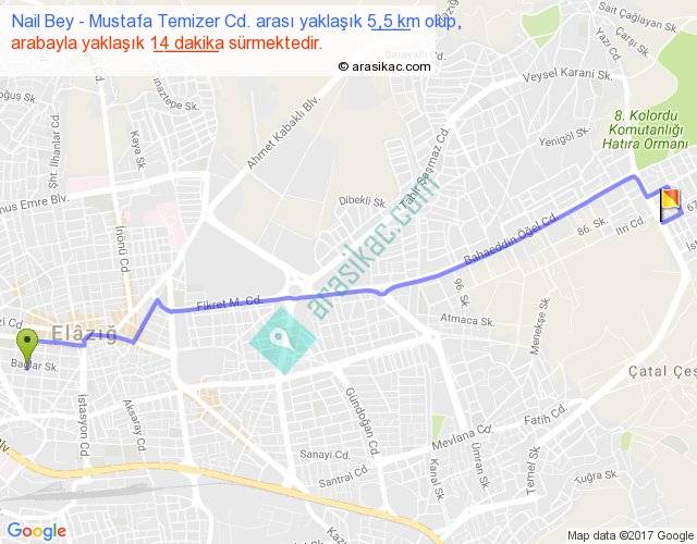 Nail Bey - Mustafa Temizer Cd. arası yaklaşık olarak 90 km/h ile yukarıda belirtilen sürede olup, iki yerin kuş uçuşu uzaklığı (mesafesi) 4'dir. Yolculuk otobüsle 18 dakika sürmektedir.