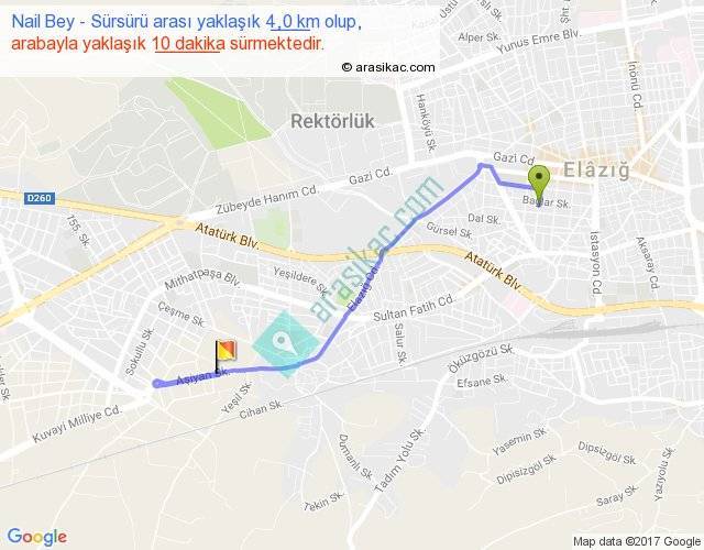 Nail Bey - Sürsürü arası yaklaşık olarak 90 km/h ile yukarıda belirtilen sürede olup, iki yerin kuş uçuşu uzaklığı (mesafesi) 2'dir. Yolculuk otobüsle 13 dakika sürmektedir.