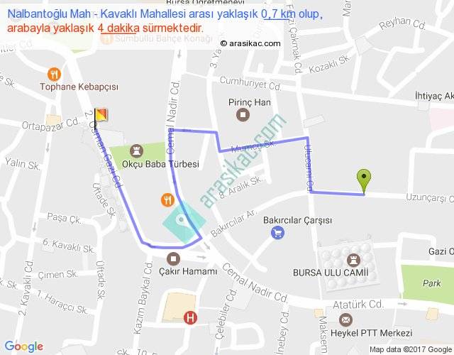 Nalbantoğlu Mah - Kavaklı Mahallesi arası yaklaşık olarak 90 km/h ile yukarıda belirtilen sürede olup, iki yerin kuş uçuşu uzaklığı (mesafesi) 0'dir. Yolculuk otobüsle 5 dakika sürmektedir.