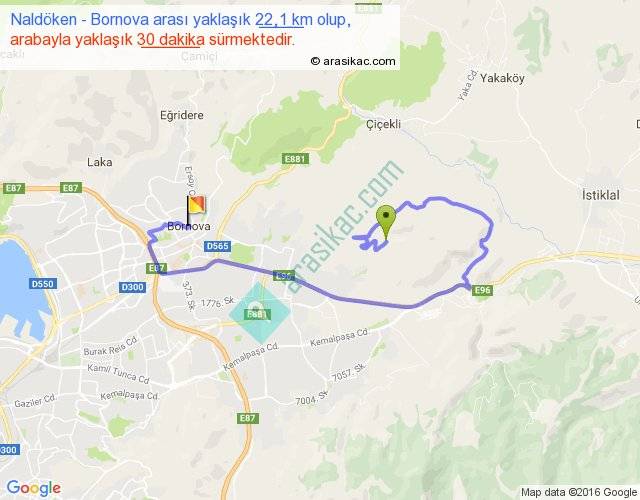 Naldöken - Bornova arası yaklaşık olarak 90 km/h ile yukarıda belirtilen sürede olup, iki yerin kuş uçuşu uzaklığı (mesafesi) 6'dir. Yolculuk otobüsle 39 dakika sürmektedir.