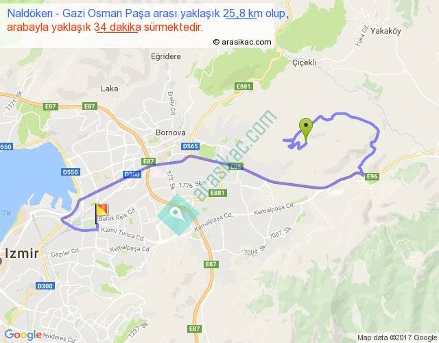 Naldöken - Gazi Osman Paşa arası yaklaşık olarak 90 km/h ile yukarıda belirtilen sürede olup, iki yerin kuş uçuşu uzaklığı (mesafesi) 10'dir. Yolculuk otobüsle 44 dakika sürmektedir.