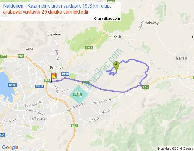 Eğer Naldöken Kazımdirik arası ne kadar yakar (benzin/mazot) diyorsanız, kilometrede 3 ₺ yakan bir aracınız var ise 57, km'de 4 ₺ yakan bir aracınız var ise 76, km'de 5 ₺ yakan bir aracınız var ise 95 ile bu yolculuğu tamamlayabilirsiniz.