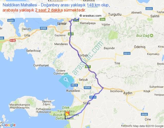 Naldöken Mahallesi - Doğanbey arası yaklaşık olarak 90 km/h ile yukarıda belirtilen sürede olup, iki yerin kuş uçuşu uzaklığı (mesafesi) 94'dir. Yolculuk otobüsle 2 saat 38 dakika sürmektedir.