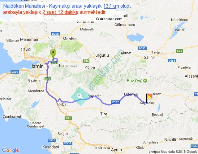 Naldöken Mahallesi - Kaymakçi arası yaklaşık olarak 90 km/h ile yukarıda belirtilen sürede olup, iki yerin kuş uçuşu uzaklığı (mesafesi) 80'dir. Yolculuk otobüsle 2 saat 51 dakika sürmektedir.