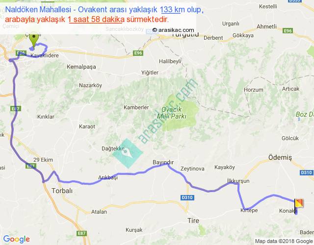 Naldöken Mahallesi - Ovakent arası yaklaşık olarak 90 km/h ile yukarıda belirtilen sürede olup, iki yerin kuş uçuşu uzaklığı (mesafesi) 75'dir. Yolculuk otobüsle 2 saat 33 dakika sürmektedir.