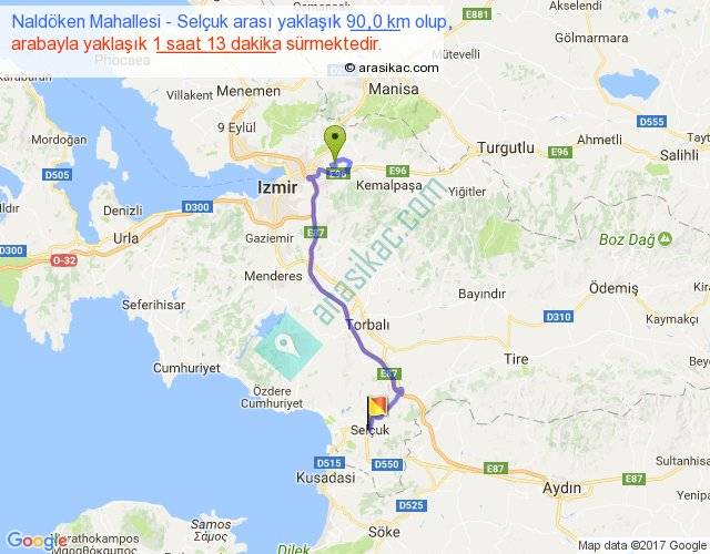 Naldöken Mahallesi - Selçuk arası yaklaşık olarak 90 km/h ile yukarıda belirtilen sürede olup, iki yerin kuş uçuşu uzaklığı (mesafesi) 58'dir. Yolculuk otobüsle 1 saat 34 dakika sürmektedir.