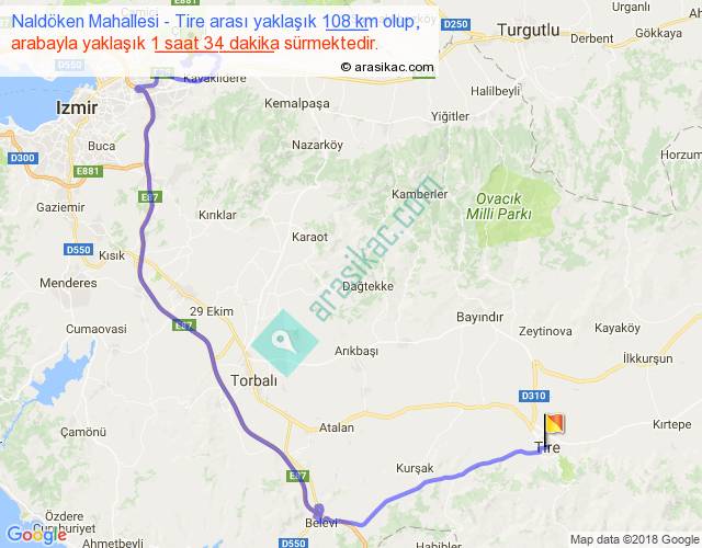 Naldöken Mahallesi - Tire arası yaklaşık olarak 90 km/h ile yukarıda belirtilen sürede olup, iki yerin kuş uçuşu uzaklığı (mesafesi) 57'dir. Yolculuk otobüsle 2 saat 2 dakika sürmektedir.