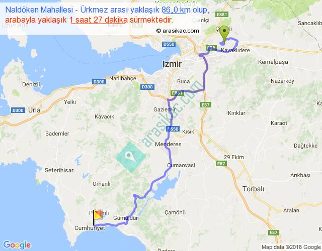 Naldöken Mahallesi - Ürkmez arası yaklaşık olarak 90 km/h ile yukarıda belirtilen sürede olup, iki yerin kuş uçuşu uzaklığı (mesafesi) 53'dir. Yolculuk otobüsle 1 saat 53 dakika sürmektedir.