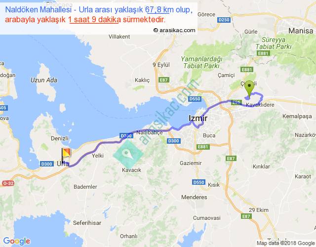 Naldöken Mahallesi - Urla arası yaklaşık olarak 90 km/h ile yukarıda belirtilen sürede olup, iki yerin kuş uçuşu uzaklığı (mesafesi) 48'dir. Yolculuk otobüsle 1 saat 29 dakika sürmektedir.