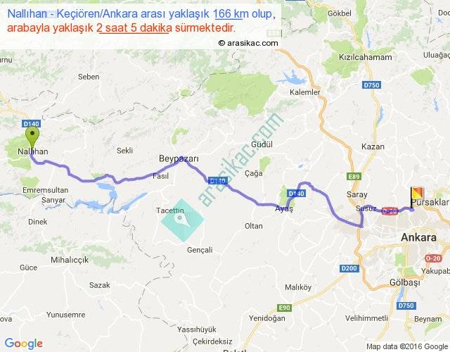 Nallıhan - Keçiören Ankara arası yaklaşık olarak 90 km/h ile yukarıda belirtilen sürede olup, iki yerin kuş uçuşu uzaklığı (mesafesi) 127'dir. Yolculuk otobüsle 2 saat 42 dakika sürmektedir.
