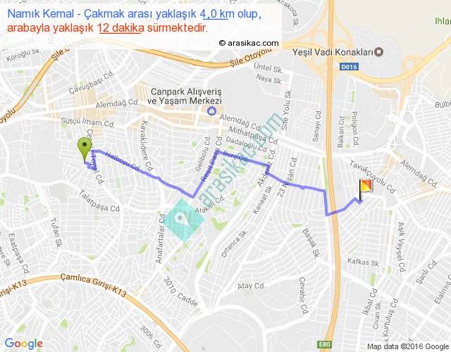 Namık Kemal - Çakmak arası yaklaşık olarak 90 km/h ile yukarıda belirtilen sürede olup, iki yerin kuş uçuşu uzaklığı (mesafesi) 3'dir. Yolculuk otobüsle 15 dakika sürmektedir.