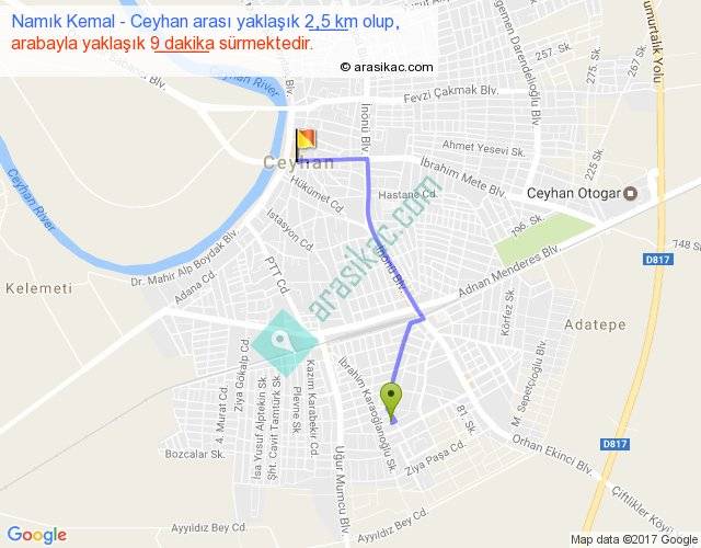 Namık Kemal - Ceyhan arası yaklaşık olarak 90 km/h ile yukarıda belirtilen sürede olup, iki yerin kuş uçuşu uzaklığı (mesafesi) 2'dir. Yolculuk otobüsle 11 dakika sürmektedir.