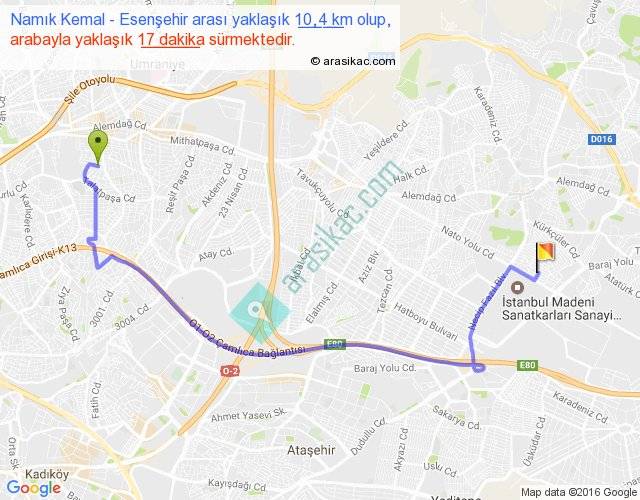 Namık Kemal - Esenşehir arası yaklaşık olarak 90 km/h ile yukarıda belirtilen sürede olup, iki yerin kuş uçuşu uzaklığı (mesafesi) 6'dir. Yolculuk otobüsle 22 dakika sürmektedir.