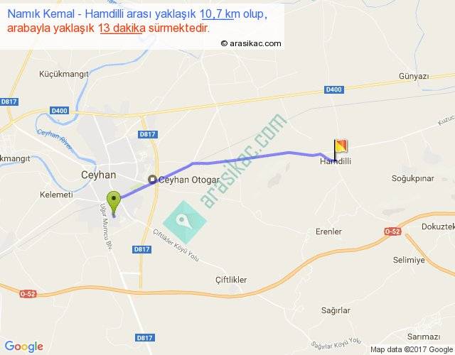 Namık Kemal - Hamdilli arası yaklaşık olarak 90 km/h ile yukarıda belirtilen sürede olup, iki yerin kuş uçuşu uzaklığı (mesafesi) 10'dir. Yolculuk otobüsle 16 dakika sürmektedir.