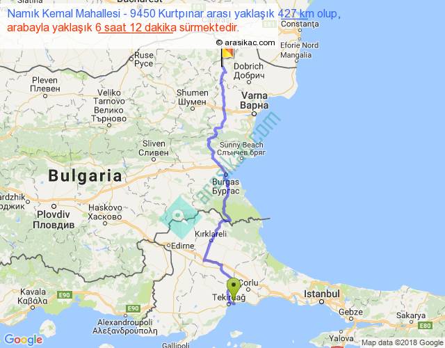 Namık Kemal Mahallesi - 9450 Kurtpınar arası yaklaşık olarak 90 km/h ile yukarıda belirtilen sürede olup, iki yerin kuş uçuşu uzaklığı (mesafesi) 305'dir. Eğer belirtilen yerler arasında uçak seferi var ise bu süre uçakla 28 dakika'ya kadar düşebilir. Yolculuk otobüsle 8 saat 3 dakika sürmektedir.