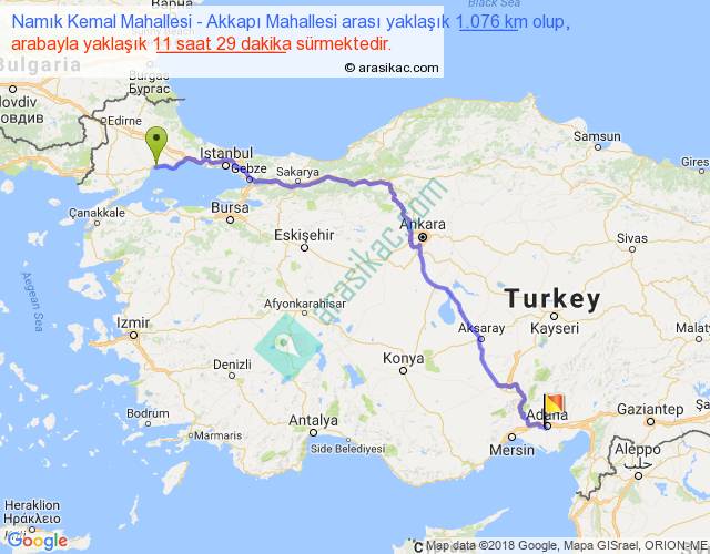 Namık Kemal Mahallesi - Akkapı Mahallesi arası yaklaşık olarak 90 km/h ile yukarıda belirtilen sürede olup, iki yerin kuş uçuşu uzaklığı (mesafesi) 798'dir. Eğer belirtilen yerler arasında uçak seferi var ise bu süre uçakla 1 saat 13 dakika'ya kadar düşebilir. Yolculuk otobüsle 14 saat 55 dakika sürmektedir.