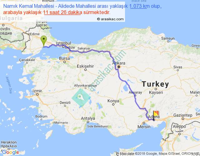 Namık Kemal Mahallesi - Alidede Mahallesi arası yaklaşık olarak 90 km/h ile yukarıda belirtilen sürede olup, iki yerin kuş uçuşu uzaklığı (mesafesi) 799'dir. Eğer belirtilen yerler arasında uçak seferi var ise bu süre uçakla 1 saat 13 dakika'ya kadar düşebilir. Yolculuk otobüsle 14 saat 51 dakika sürmektedir.
