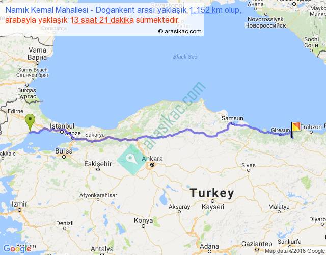 Namık Kemal Mahallesi - Doğankent arası yaklaşık olarak 90 km/h ile yukarıda belirtilen sürede olup, iki yerin kuş uçuşu uzaklığı (mesafesi) 946'dir. Eğer belirtilen yerler arasında uçak seferi var ise bu süre uçakla 1 saat 27 dakika'ya kadar düşebilir. Yolculuk otobüsle 17 saat 21 dakika sürmektedir.