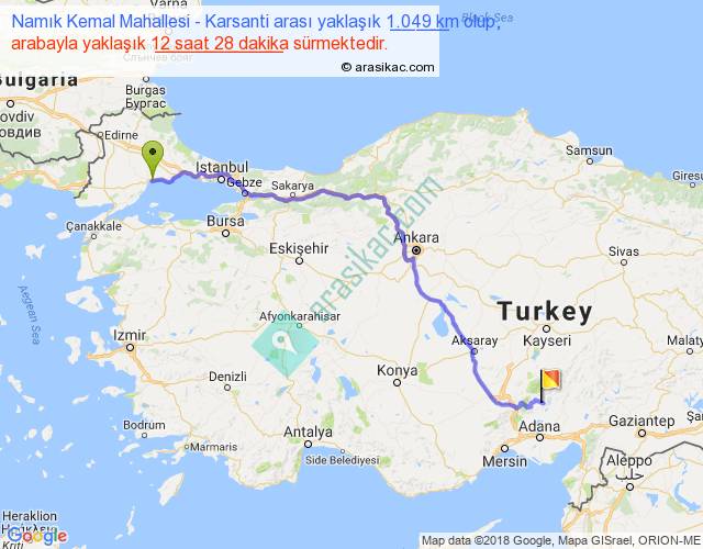 Namık Kemal Mahallesi - Karsanti arası yaklaşık olarak 90 km/h ile yukarıda belirtilen sürede olup, iki yerin kuş uçuşu uzaklığı (mesafesi) 769'dir. Eğer belirtilen yerler arasında uçak seferi var ise bu süre uçakla 1 saat 10 dakika'ya kadar düşebilir. Yolculuk otobüsle 16 saat 12 dakika sürmektedir.