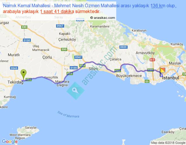 Namık Kemal Mahallesi - Mehmet Nesih Özmen Mahallesi arası yaklaşık olarak 90 km/h ile yukarıda belirtilen sürede olup, iki yerin kuş uçuşu uzaklığı (mesafesi) 108'dir. Yolculuk otobüsle 2 saat 11 dakika sürmektedir.
