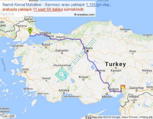 Namık Kemal Mahallesi - Sarımazı arası yaklaşık olarak 90 km/h ile yukarıda belirtilen sürede olup, iki yerin kuş uçuşu uzaklığı (mesafesi) 846'dir. Eğer belirtilen yerler arasında uçak seferi var ise bu süre uçakla 1 saat 18 dakika'ya kadar düşebilir. Yolculuk otobüsle 15 saat 34 dakika sürmektedir.