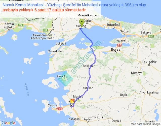 Namık Kemal Mahallesi - Yüzbaşı Şerafettin Mahallesi arası yaklaşık olarak 90 km/h ile yukarıda belirtilen sürede olup, iki yerin kuş uçuşu uzaklığı (mesafesi) 294'dir. Eğer belirtilen yerler arasında uçak seferi var ise bu süre uçakla 27 dakika'ya kadar düşebilir. Yolculuk otobüsle 8 saat 10 dakika sürmektedir.