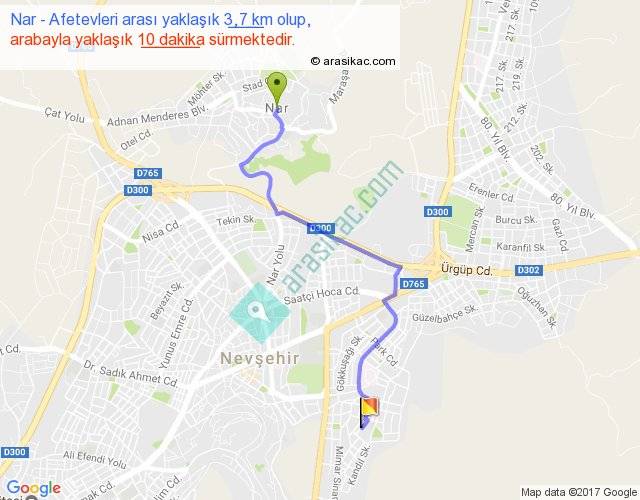Nar - Afetevleri arası yaklaşık olarak 90 km/h ile yukarıda belirtilen sürede olup, iki yerin kuş uçuşu uzaklığı (mesafesi) 2'dir. Yolculuk otobüsle 13 dakika sürmektedir.
