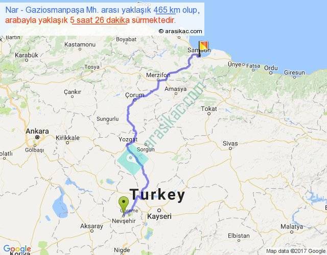 Nar - Gaziosmanpaşa Mh. arası yaklaşık olarak 90 km/h ile yukarıda belirtilen sürede olup, iki yerin kuş uçuşu uzaklığı (mesafesi) 320'dir. Eğer belirtilen yerler arasında uçak seferi var ise bu süre uçakla 29 dakika'ya kadar düşebilir. Yolculuk otobüsle 7 saat 3 dakika sürmektedir.
